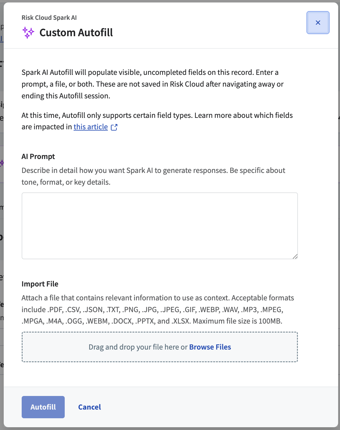 - Autofill will populate supported fields only when enough context is available from the selected sources. If the provided prompt or file lacks sufficient information, some supported fields may remain blank.