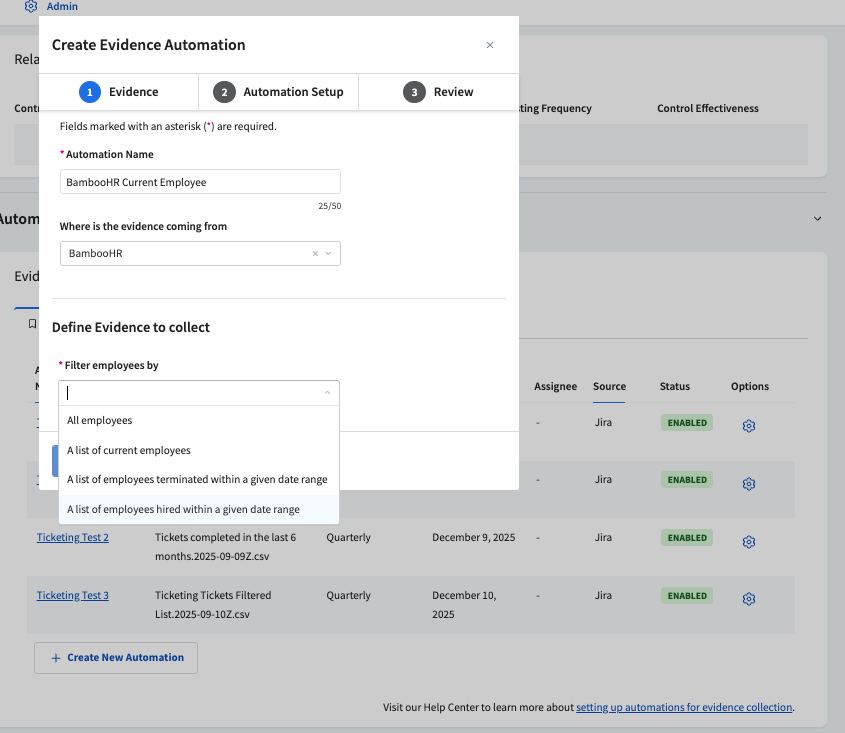 Automated Evidence Collection (AEC) supports a variety of HRIS systems (see our website for the full list > filter by Integration Type: Evidence Sources), including BambooHR, Workday, and more. With this feature, you can automatically pull HRIS data—such as current employee lists, terminated employees, or new hires—on demand or on a recurring schedule.
