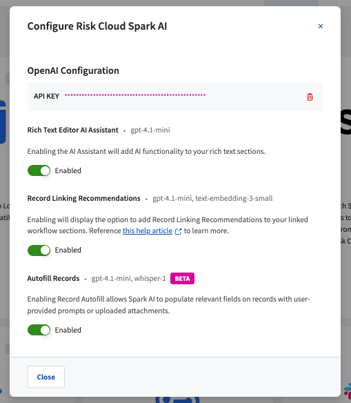 Your data is protected through end-to-end encryption. When you run Autofill, only the supported fields on the record and prompt/file in the session are transmitted to OpenAI’s API for processing. The data is never used to train AI models, and if you use LogicGate’s managed key, OpenAI retains it for 30 days only for security monitoring before deletion. If you prefer full control, you can connect your own OpenAI API key, which lets your organization manage data handling and retention directly. For a deeper look at Spark AI’s privacy and governance safeguards, see the Help Center article: Convince Your Boss: Why Spark AI Is Safe, Secure, and Ready for Governance Approval.