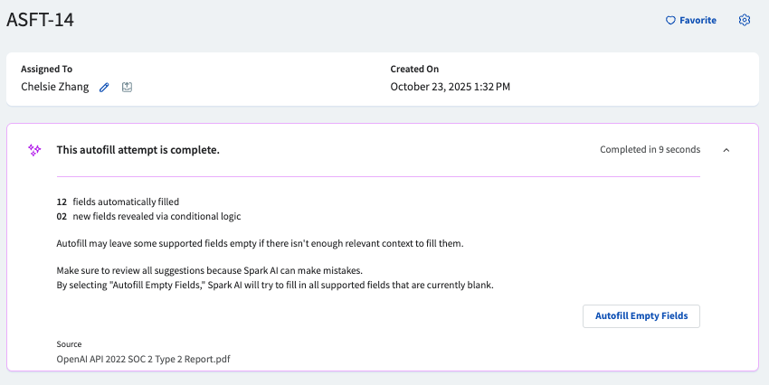 - All Autofill-generated values are also recorded in the Field Audit Log, preserving the history of what Spark AI previously populated.