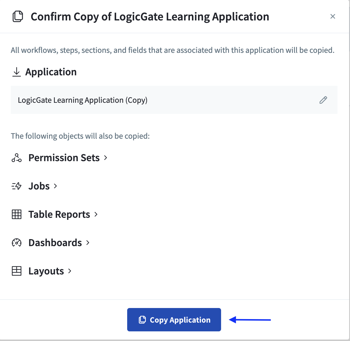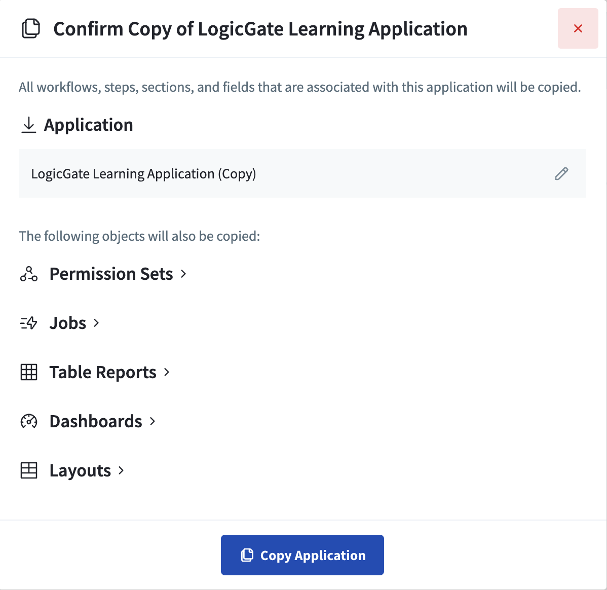 The "Confirm Copy" modal will appear. In this modal, you can rename any of the objects in the Application by clicking the Pencil icon to the right of the name and typing in the new name. By default, each object in the copied Application will have a " (Copy)" added to its original name.