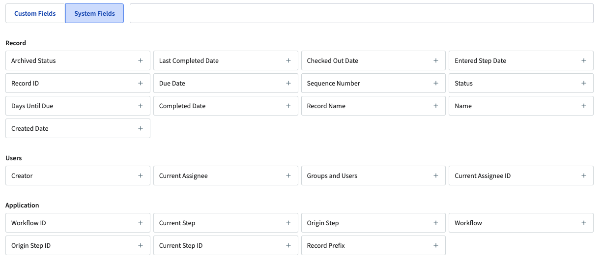 System Fields are Risk Cloud auto-generated Fields for Records that can be utilized within Layouts, Table Reports, and Visual Reports. System Fields fall within one of three distinct categories: Record, Users, or Application. The image below shows a list of System Fields as seen in the Field Finder when creating a Table Report.