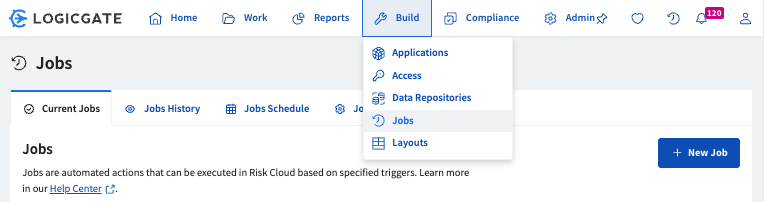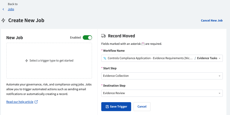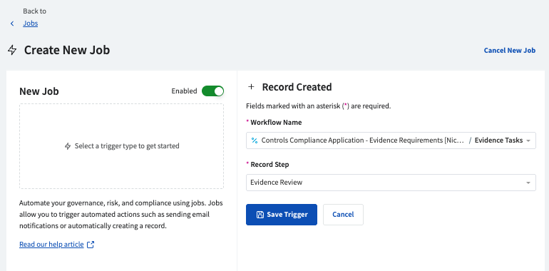 Spark AI Automated Evidence Testing is configured in Risk Cloud Jobs. Follow the steps below to create a job that automates evidence tests when evidence records are created or moved. To learn more about Risk Cloud Jobs, refer to the Help Center Article.