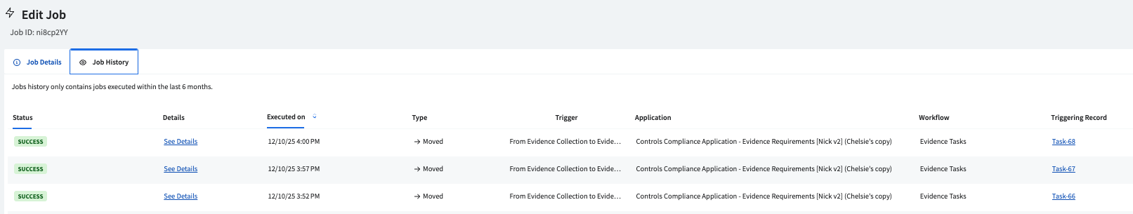 Run AEC immediately or on its scheduled cadence. When AEC creates a new record in the workflow step configured with a Record Created trigger, the Run Evidence Test job operation is automatically triggered.
