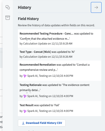 Audit Trial: Every field populated by Automated Evidence Testing is recorded in the Field History side panel and is exportable as a CSV. Logged details include the field name, updated value, record ID, job name, executor (Spark AI – Testing), record assignee, and timestamp. This provides full traceability for all AI-generated field updates.