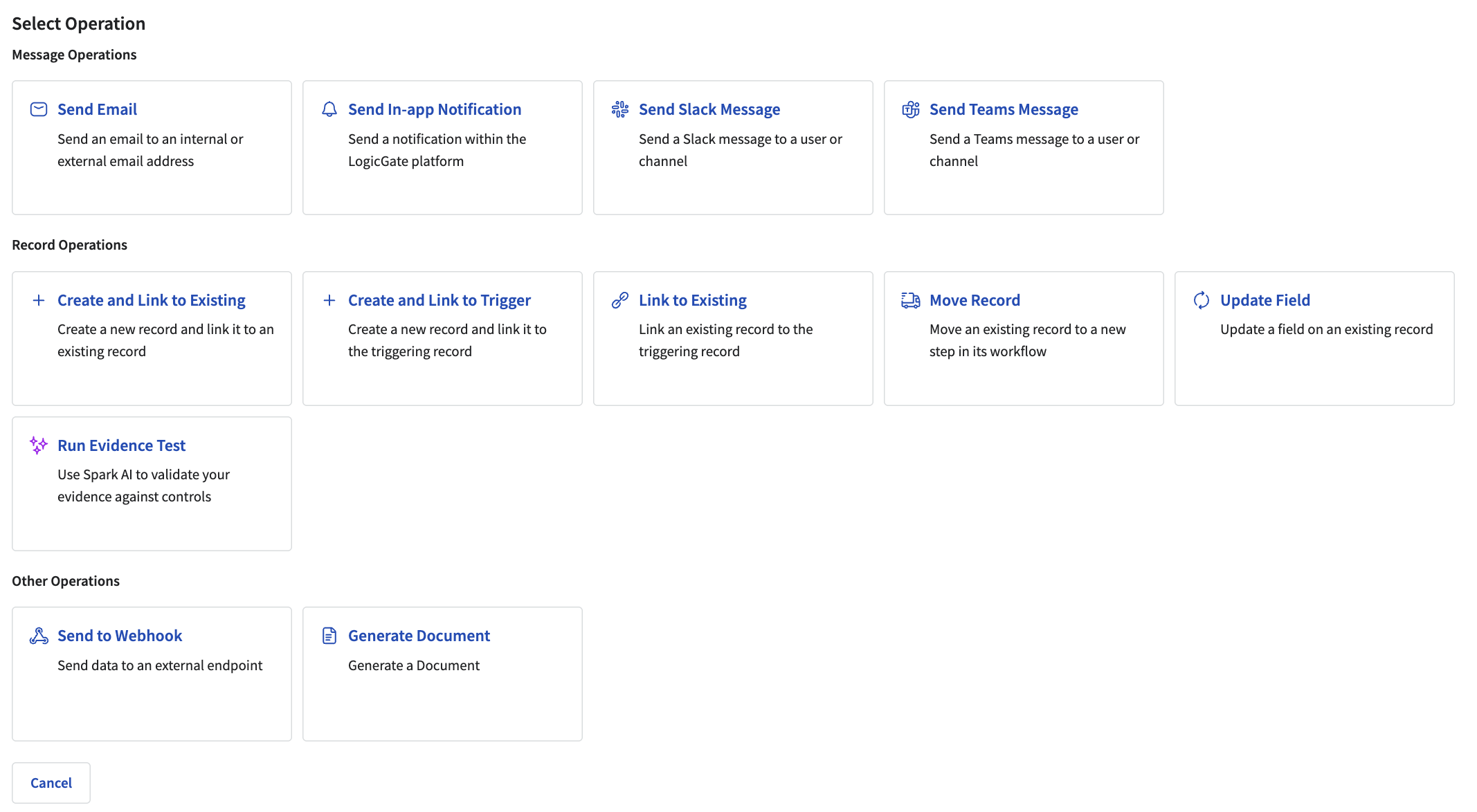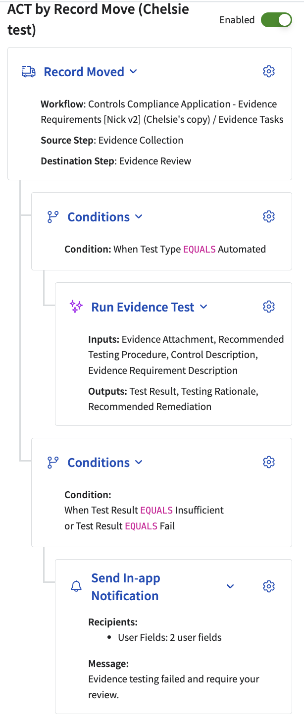 For example, you can configure a condition to run evidence test only when the Test Type field equals Automated if you don't want all evidence submitted goes through Spark AI Automated Evidence Testing. You can also combine this with other operations, such as notifying the Evidence Owner when a test result fails.