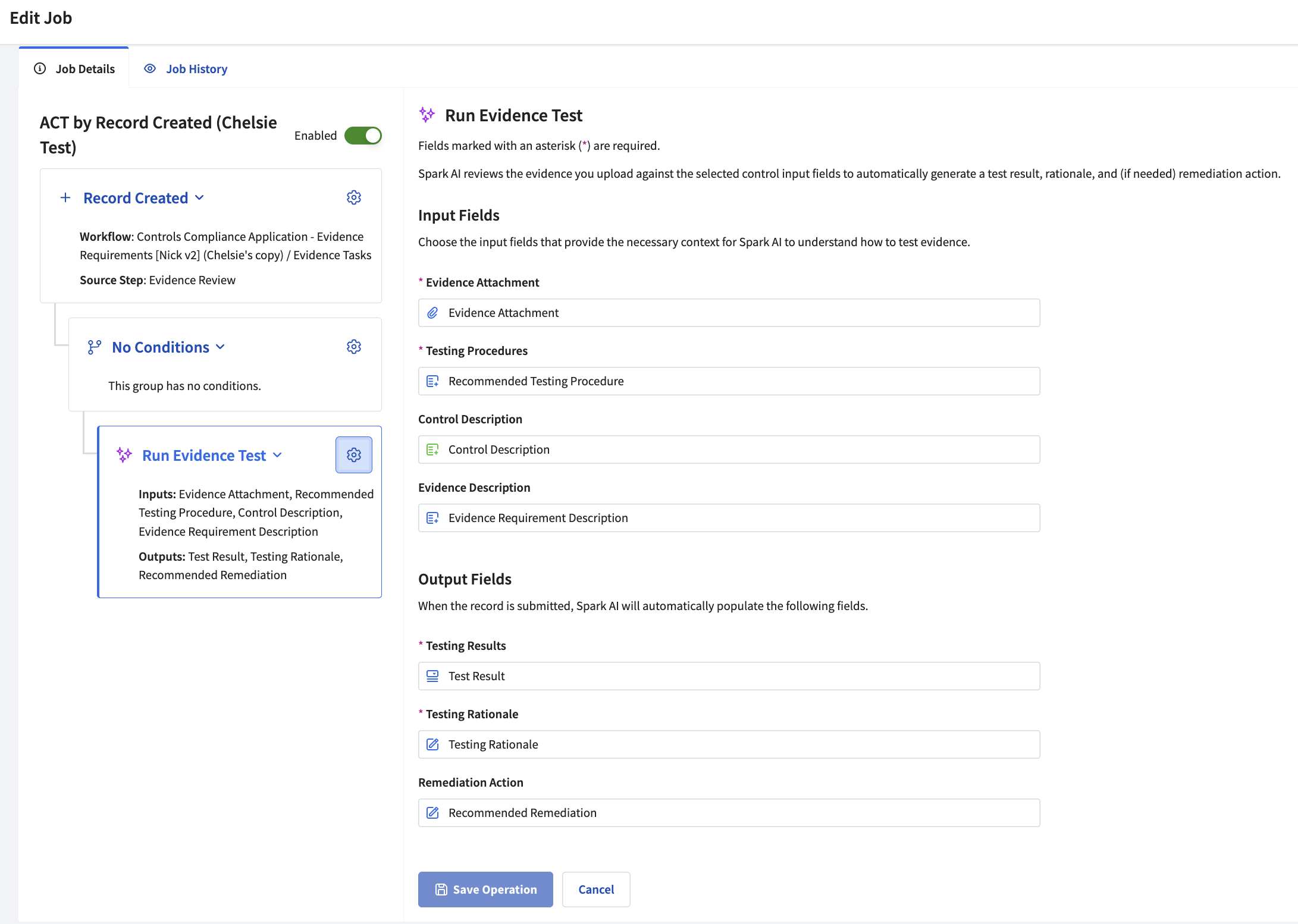 - By enabling Automated Evidence Testing, you will have access to a new Job operation card called "Run Evidence Test" when you set up the Job Automations within Controls Compliance Application.