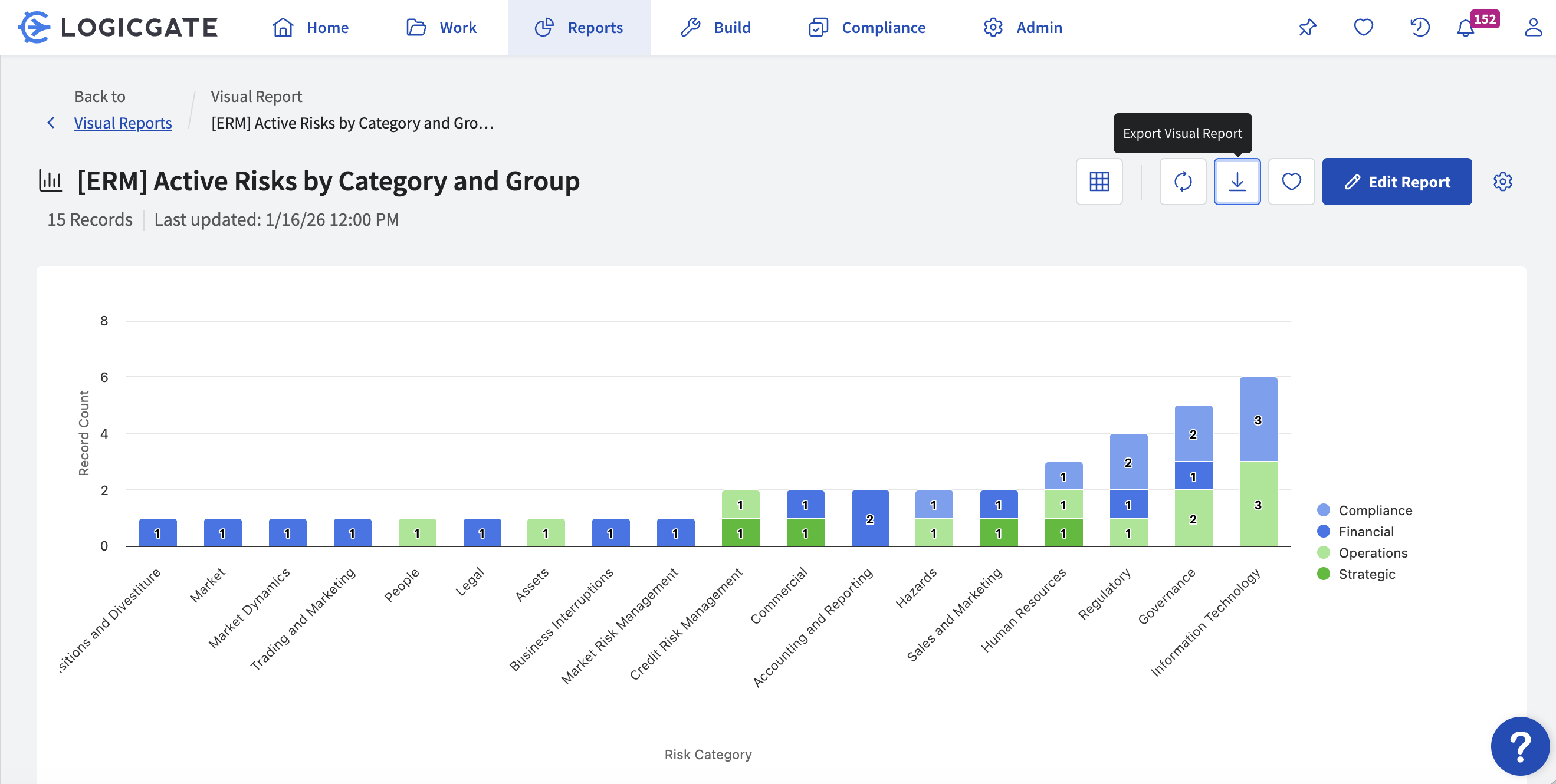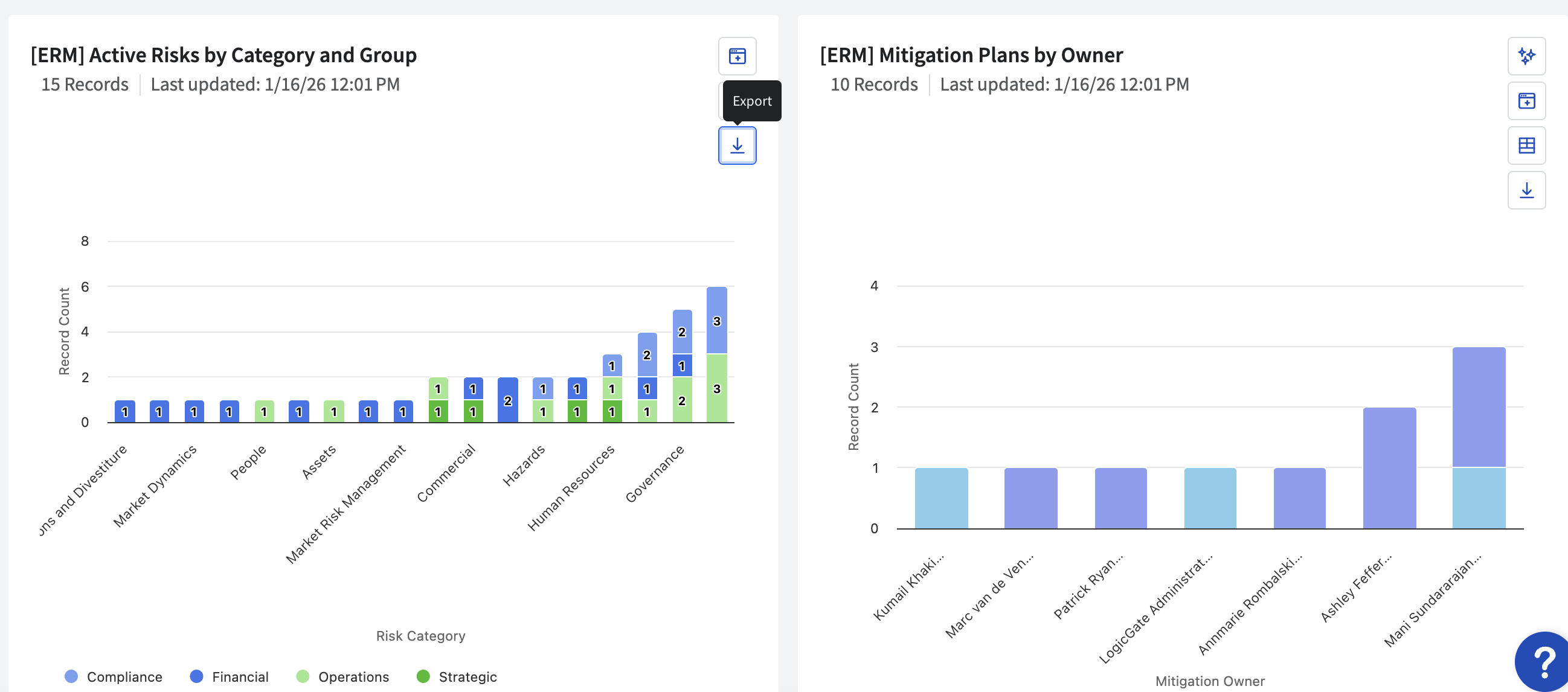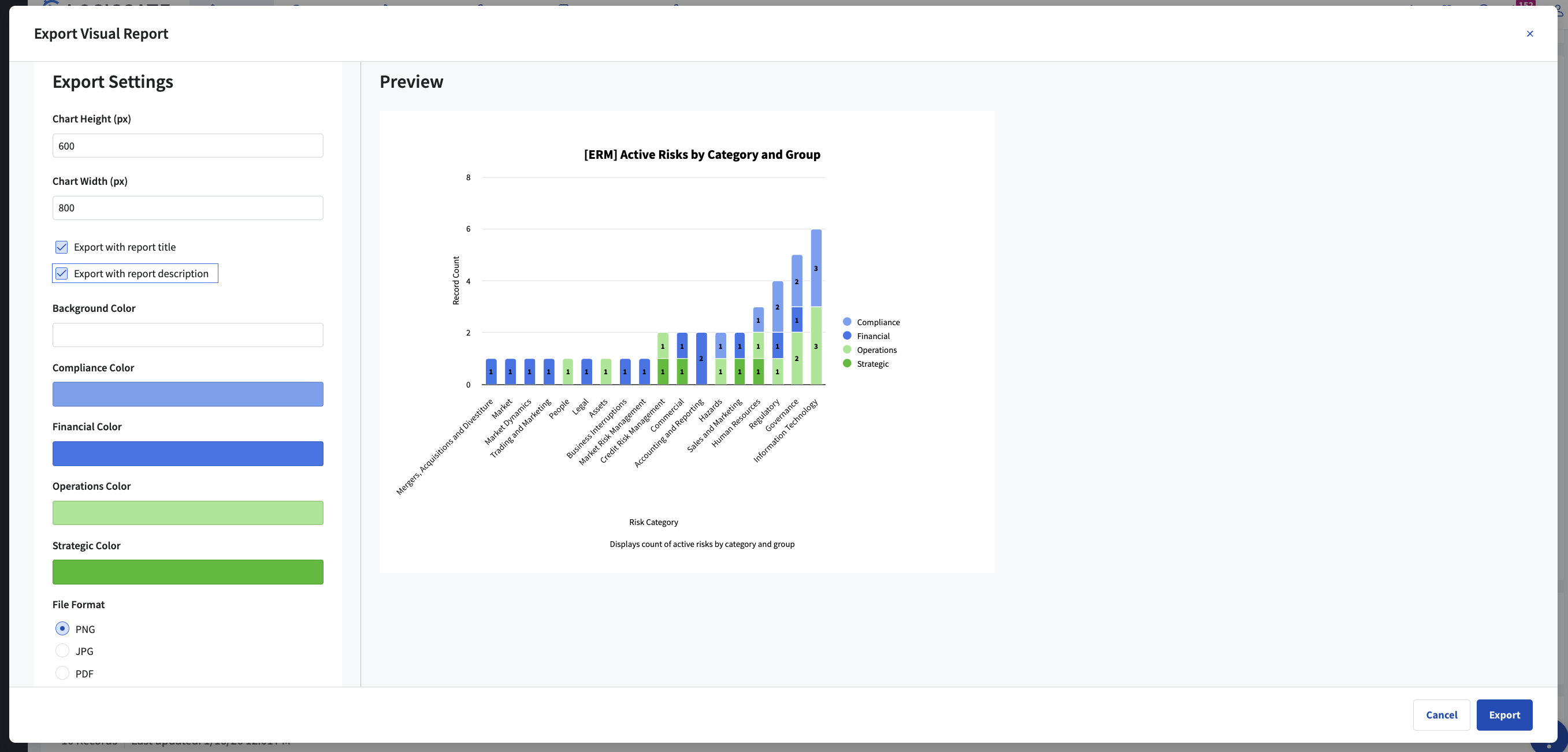 Exporting Visual Reports allows you to easily share visualized metrics with stakeholders across their organization who do not have access to Risk Cloud and in presentations.