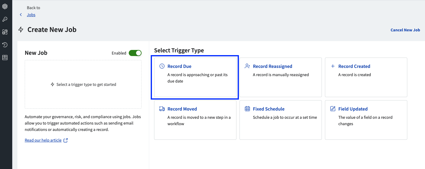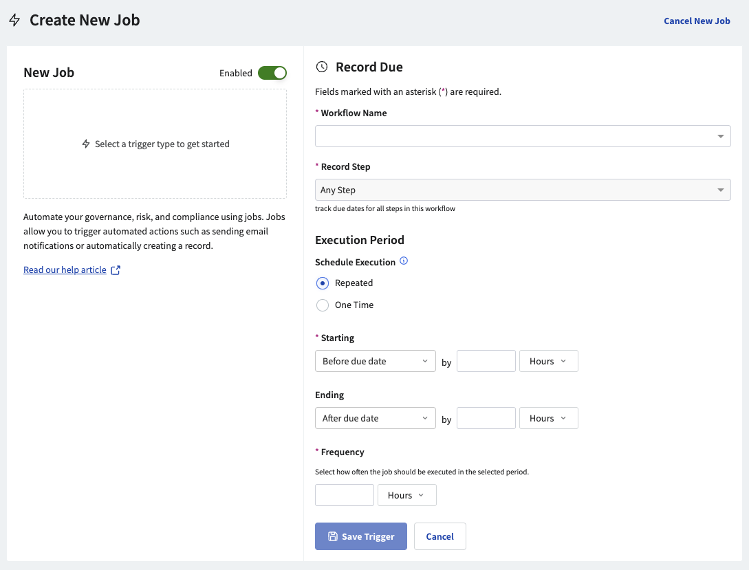 3. Once the Job Trigger (Record Due) is selected, fill out the following information to dictate the Workflow, the Record Step where the Job is triggered, and when and how often notifications are sent: